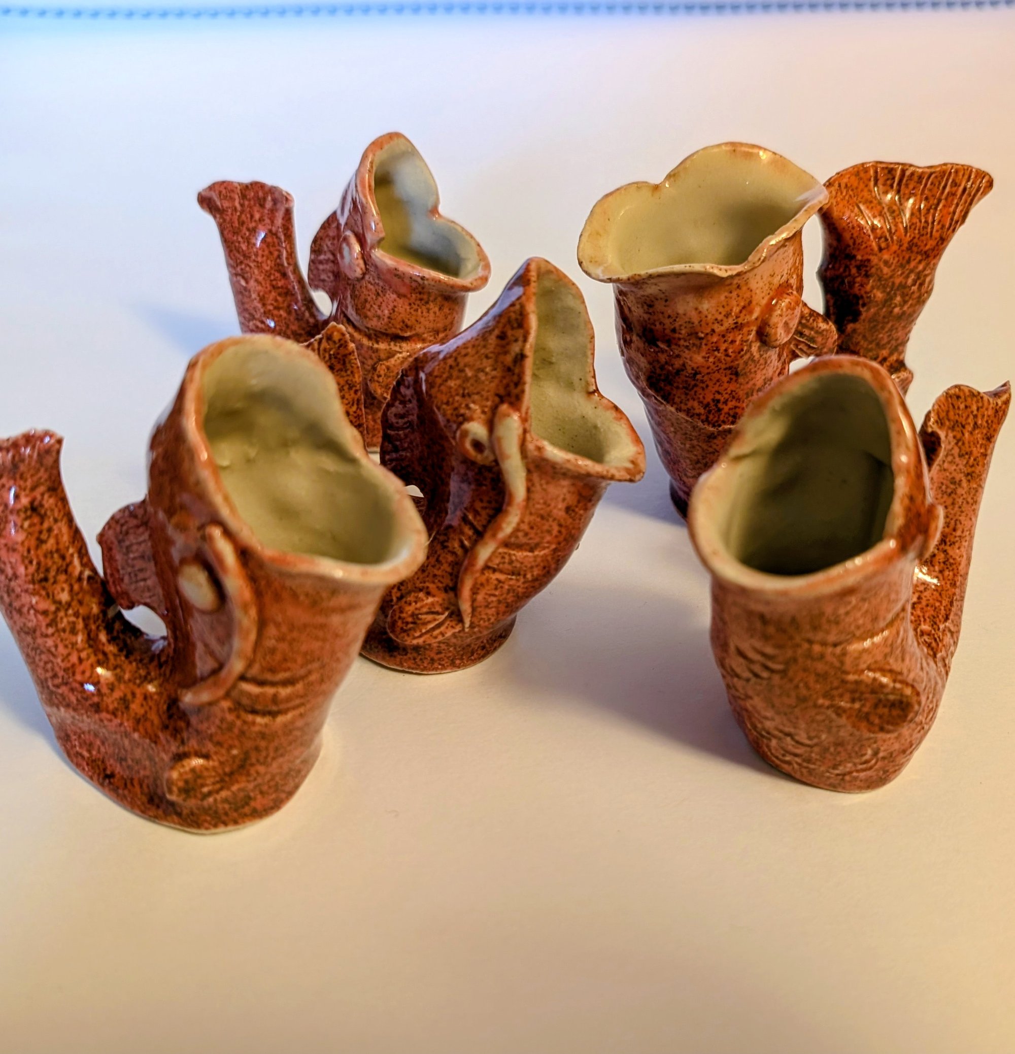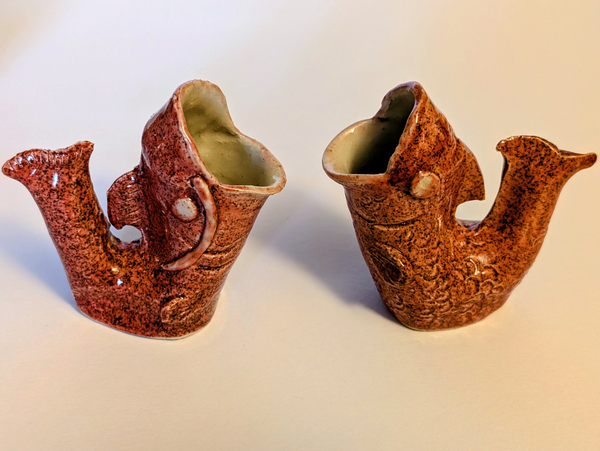 This fish-shaped gluggle jug stands 7cm tall and holds 50ml of whatever liquid you care to put in it. It is my take on the Victorian classic design, however, because it is crafted using wheel-throwing and hand-building techniques, rather than mass produced, each one is unique. It makes a charming glugging sound when liquid is poured out.