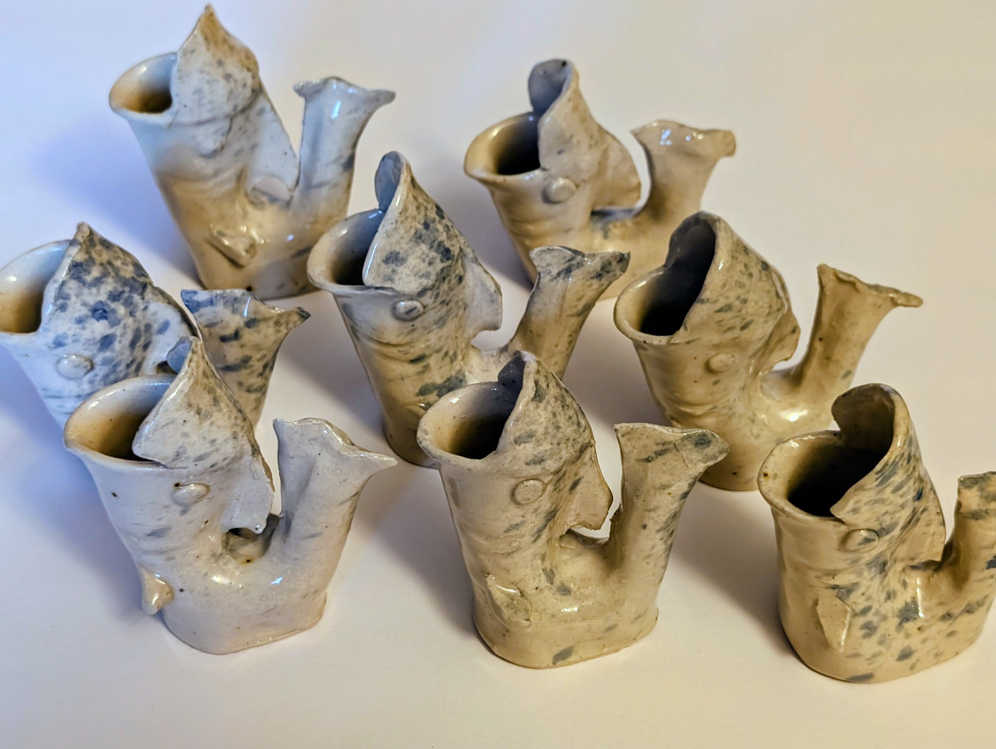 This fish-shaped gluggle jug stands between 7 and 9cm tall and holds 50ml of whatever liquid you care to put in it. It is my take on the Victorian classic design, however, because it is crafted using wheel-throwing and hand-building techniques, rather than mass produced, each one is unique. It makes a charming glugging sound when liquid is poured out.