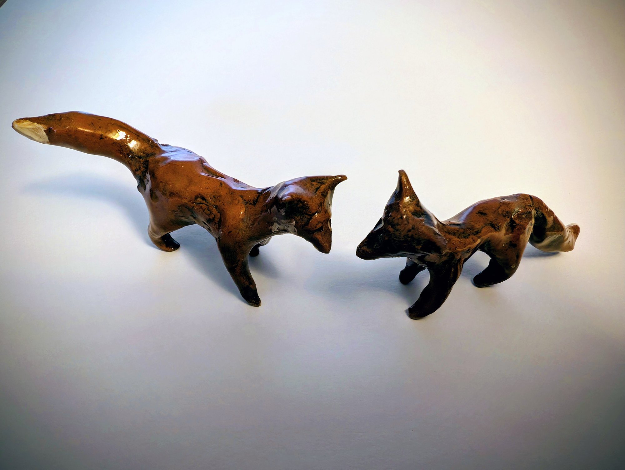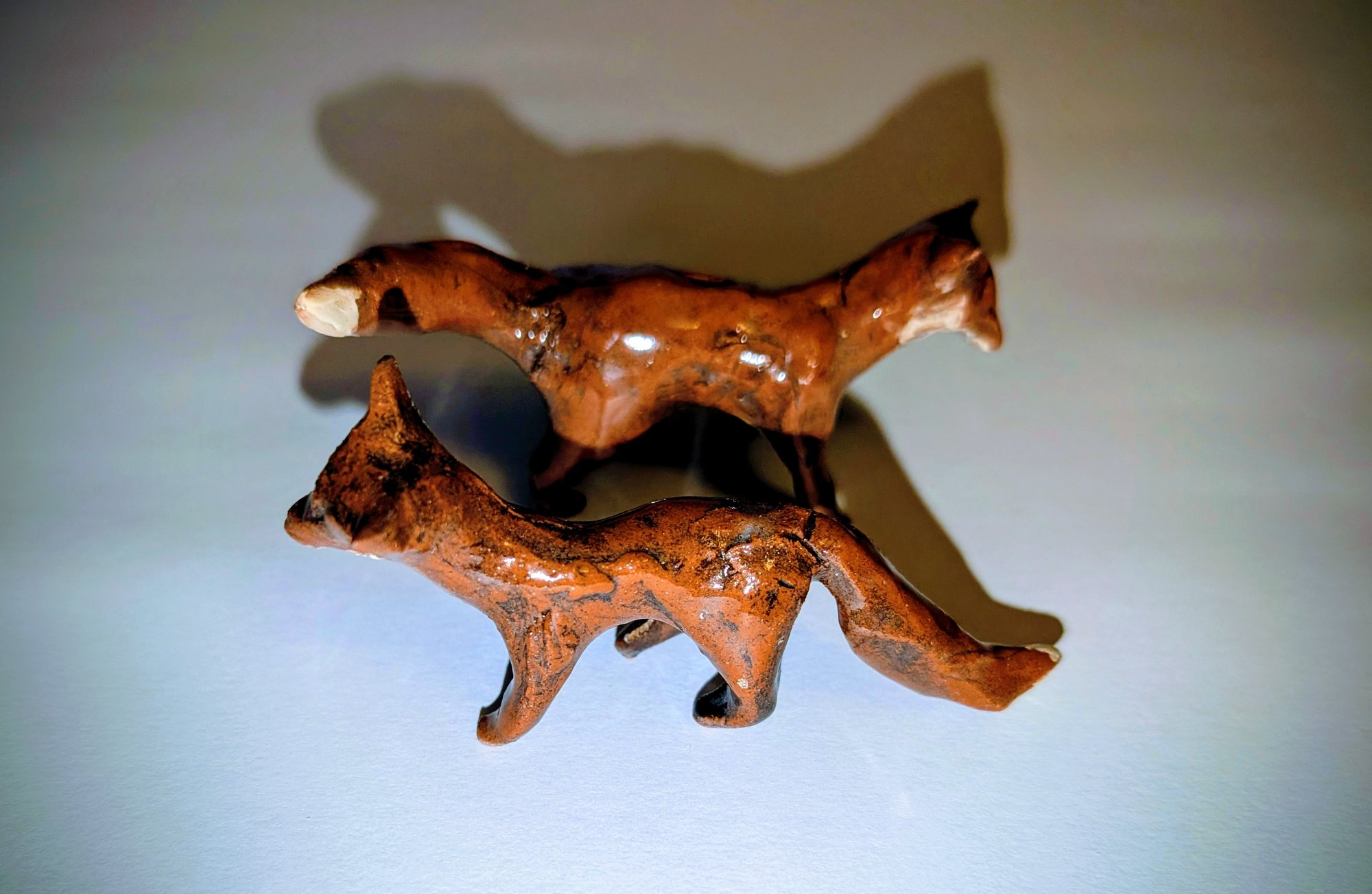 These small, pinch-formed terracotta foxes stand 5 to 8cm tall. They are made at speed, by pinching, squeezing and moulding a single piece of clay. The fast pace of production lends itself to the creation of figures full of energy and charm. No two are identical.