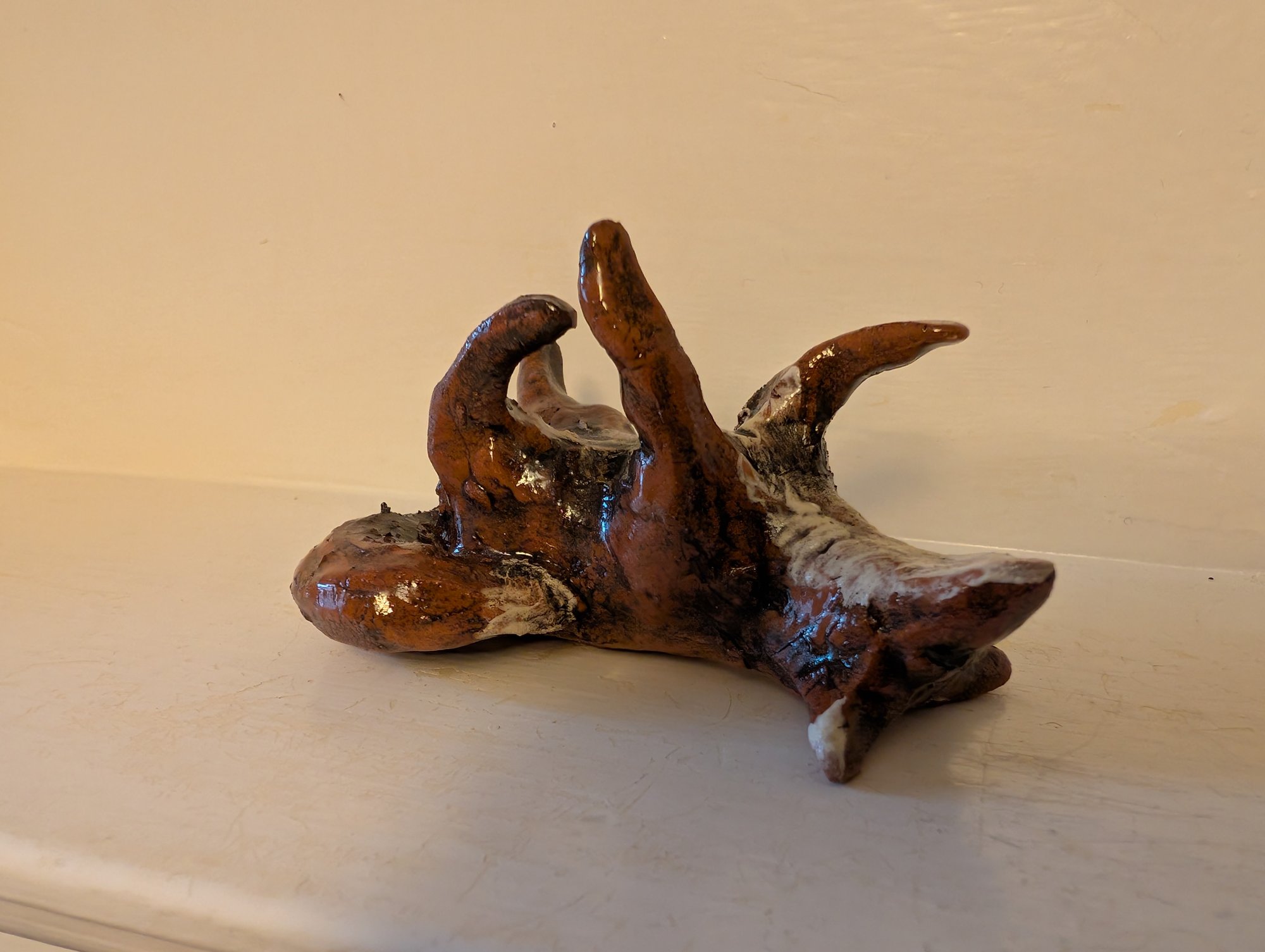 These small, pinch-formed terracotta foxes are 5 to 8cm long. They are made at speed, by pinching, squeezing and moulding a single piece of clay. The fast pace of production lends itself to the creation of figures full of energy and charm. No two are identical.